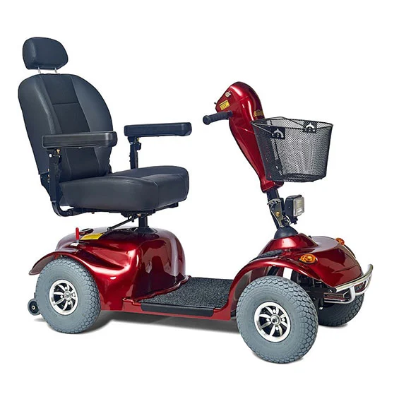 Avenger 4 Wheel GA541 Mobility Scooter from Golden. The Golden Avenger a four-wheel, heavy-duty scooter provides an impressive blend of rugged outdoor maneuverability while giving a smooth, comfortable ride over a variety of nature’s most challenging terrains. Durable and stylish, the Avenger includes a standard front basket, a full lighting package and an extra roomy seat with an adjustable headrest. Featuring a 500 lb. weight capacity, the Avenger uses two NF-22 batteries that provide a range of up to 18 miles between charges.